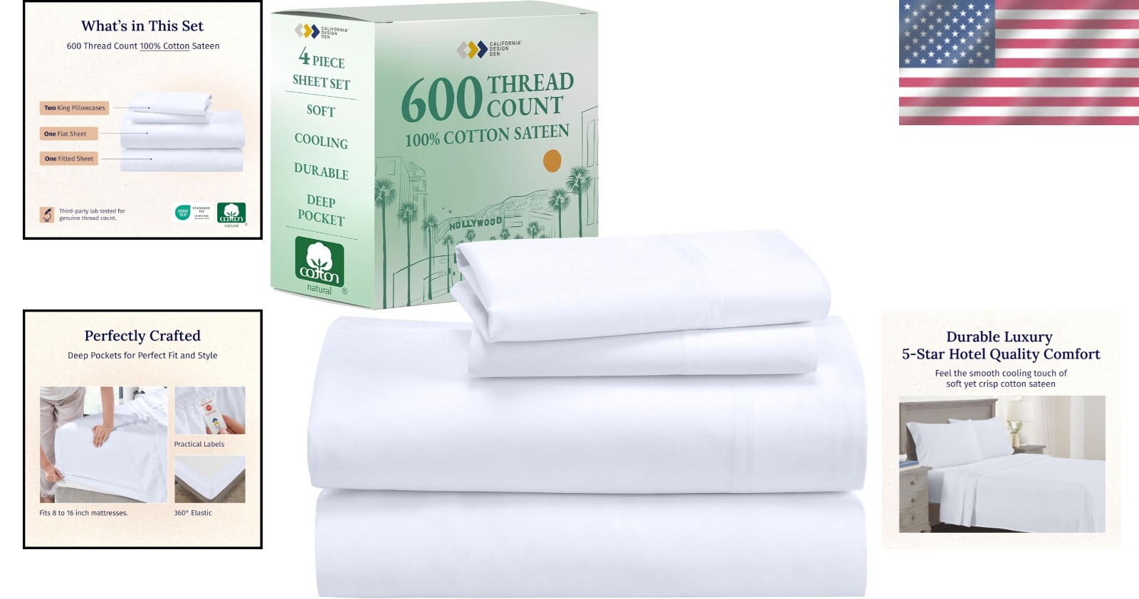 Indulge in the exquisite softness of our certified 600 thread count sateen 100% cotton sheets, delivering a modern five-star hotel experience right in your own bedroom. Our cooling and breathable bright white California king sheet set ensures comfort across all seasons.