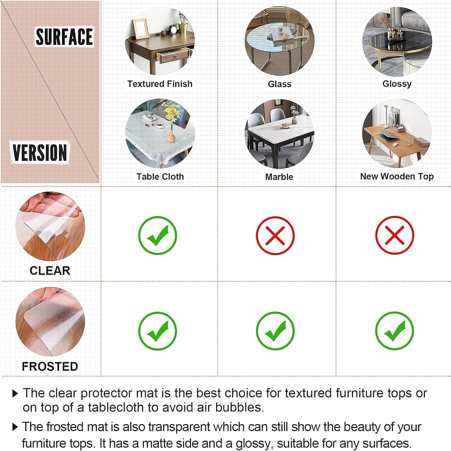 Perfect for textured surfaces or layered tablecloths; ideal for smooth finishes with frosted versions.