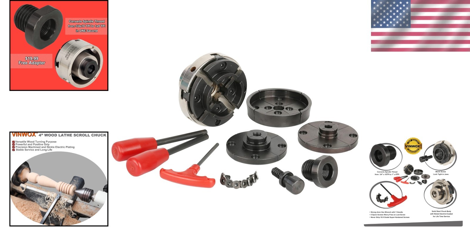 Included Components: Chuck body, 2" Dovetail Jaw, Pin Jaw, Step Jaw, Wide Jaw, two tightening bars, T-Allen wrench, Worm Screw Chuck, and an adapter converting 1" x 8TPI to 3/4" x 16TPI.