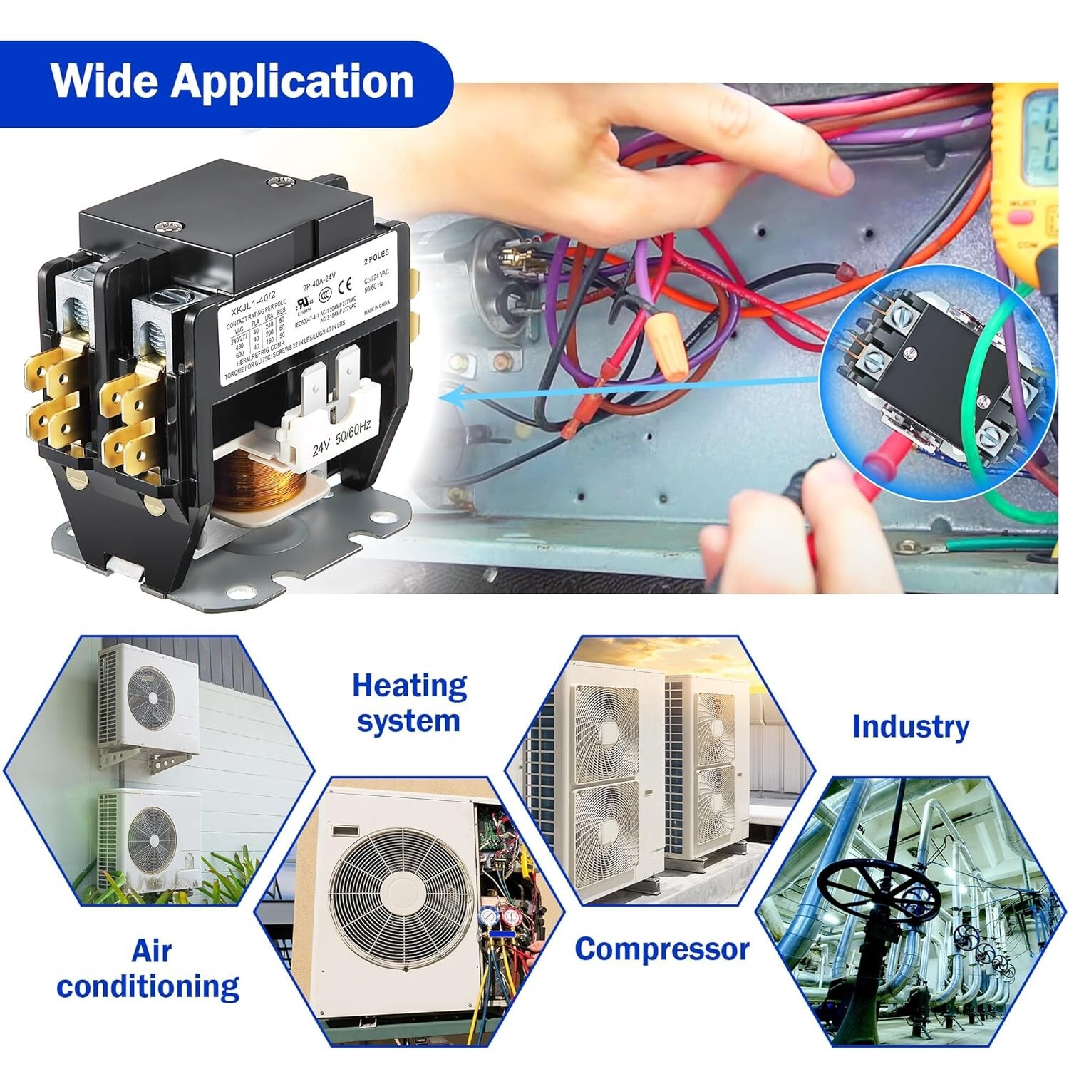 Reliable Performance: Engineered with 24V coil 2 pole technology, delivers 40A Full Load Amperage (FLA) and 50A Resistive Load (RES), aligning with UL508 standards.