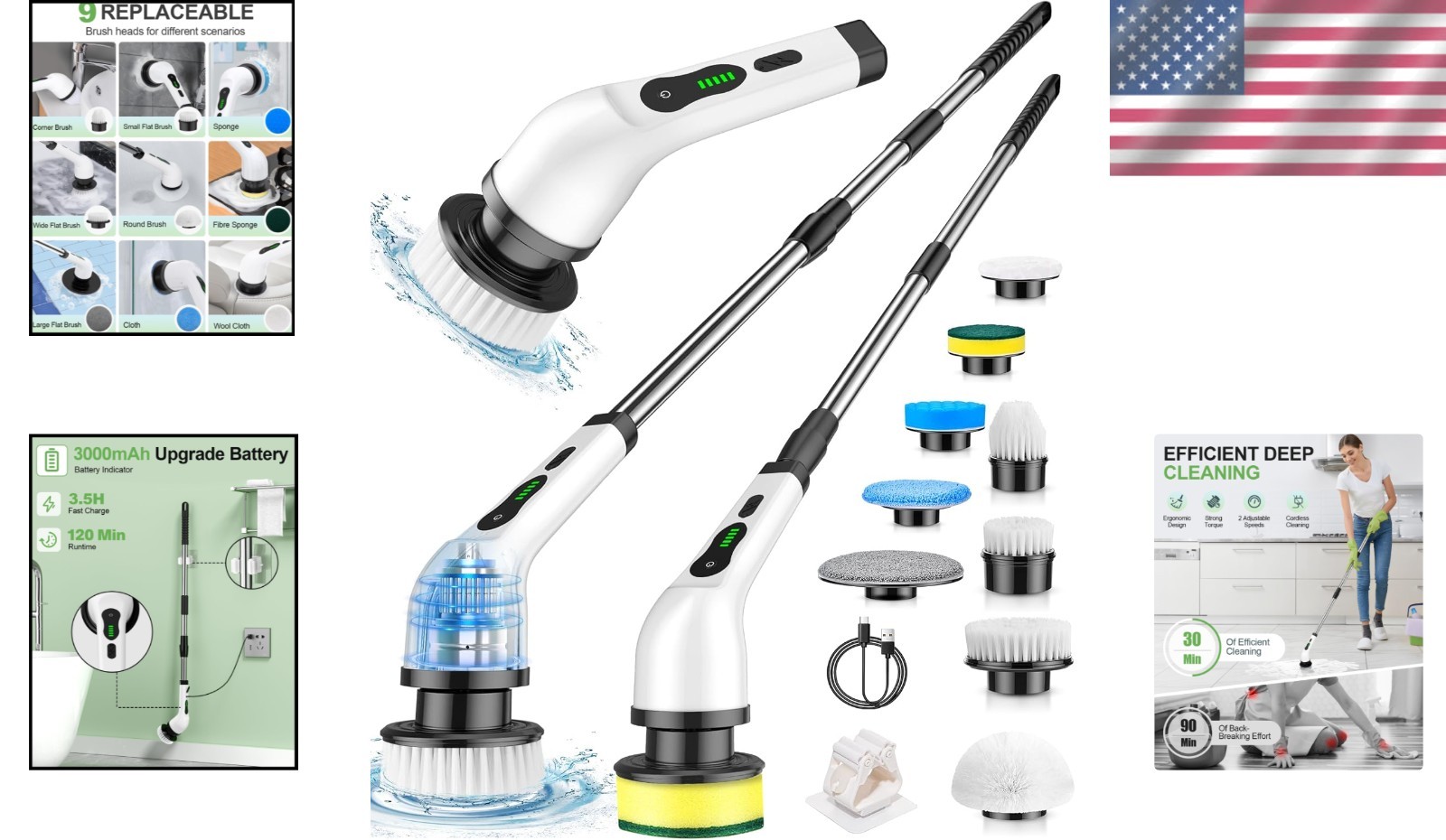 9 Detachable Brushes: Includes a round brush for curved surfaces, flat brush for tile floors, corner brush for tight gaps, and sponge brush for windows. Endless cleaning possibilities await!