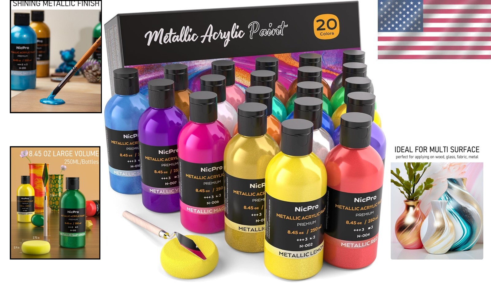20 Color Metallic Acrylic Paint Set (8.45 Oz Each) - Non-Toxic, Quick-Dry Art Supplies