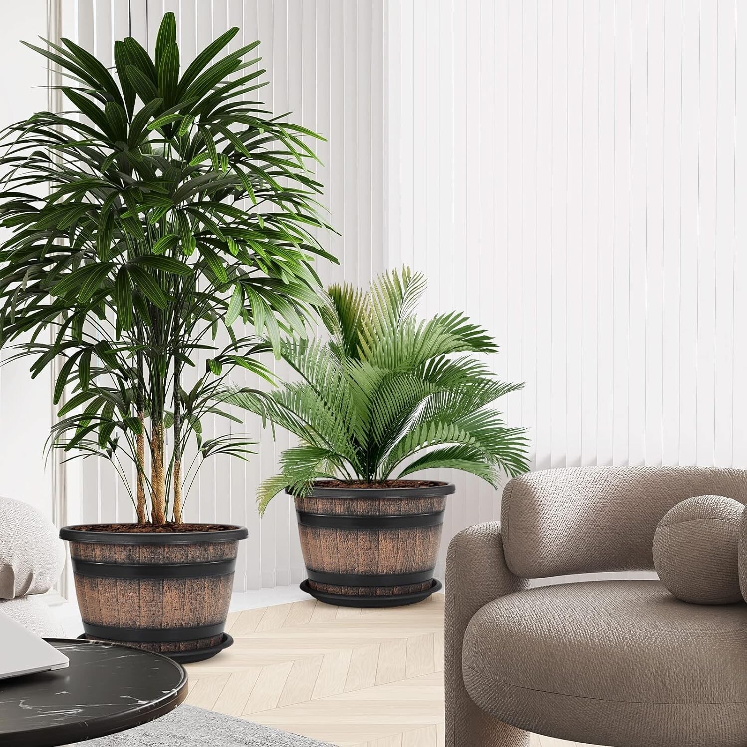 Transform your gardening experience with our Elegant 14" Round Resin Flower Pots. Not only do they provide a stylish touch with their whiskey barrel design, but their practical features assure optimal growing conditions for your beloved plants. Enjoy the peace of mind that comes with high-quality materials and thoughtful design - the perfect combination for any indoor or outdoor gardener.